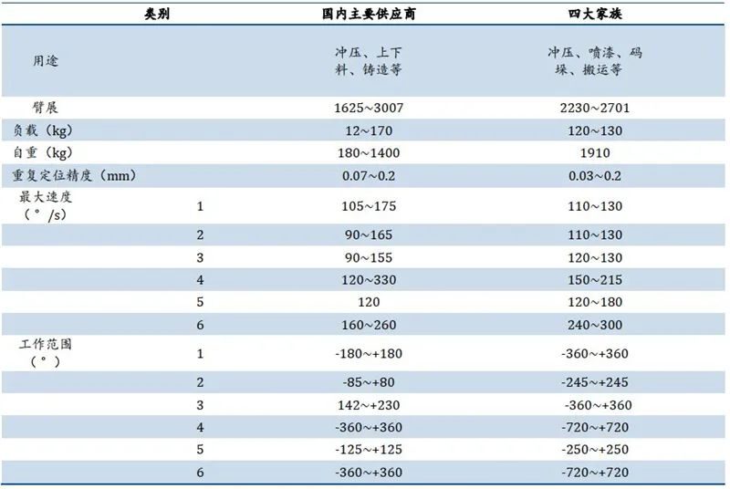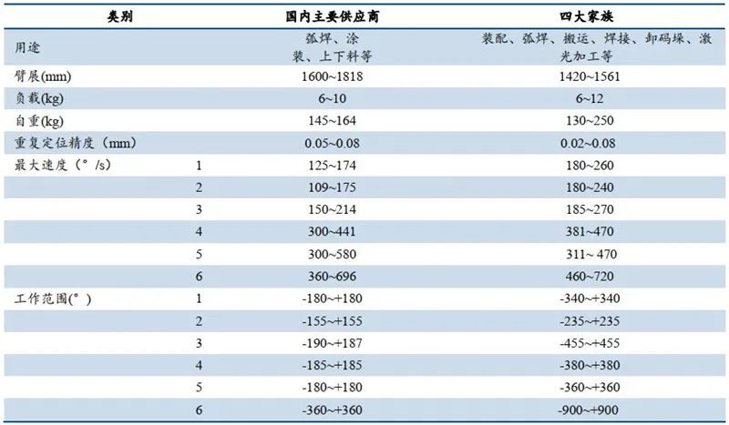 在覆盖范围方面,国内主要供应商机器人可实现1440mm-2010mm,与四大家族产品可实现的 1200mm-2028mm 大体相当。最高轴速方面,国内除了工业机器人龙头可达约 700°/s 外,大部分工业机器人的最高轴速与海外品牌仍存在一定差距。
