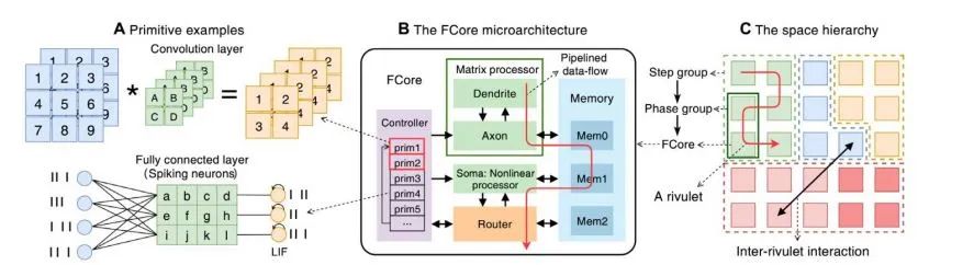 在该模型中,每个空间单元都有其内存和控制器用于计算,将神经网络和SNN统一为“静态数据”和“动态数据”,静态数据固定在相应的内存中,动态数据则在相邻的执行单元之间流动。
