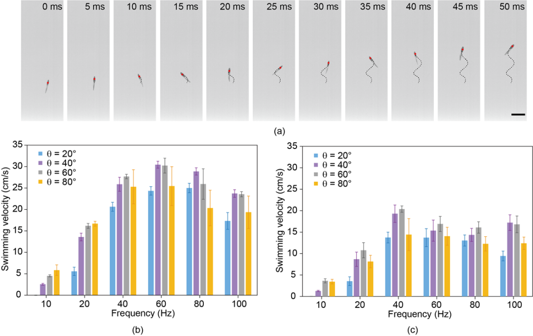 虽然足够小巧,但游泳能力不弱。研究人员通过施加不同振荡角和不同频率的磁场来控制它的运动。实验发现,例如当频率为60 Hz,振荡角为40°时,磁驱软体鱼可以达到30 cm/s的游泳速度。