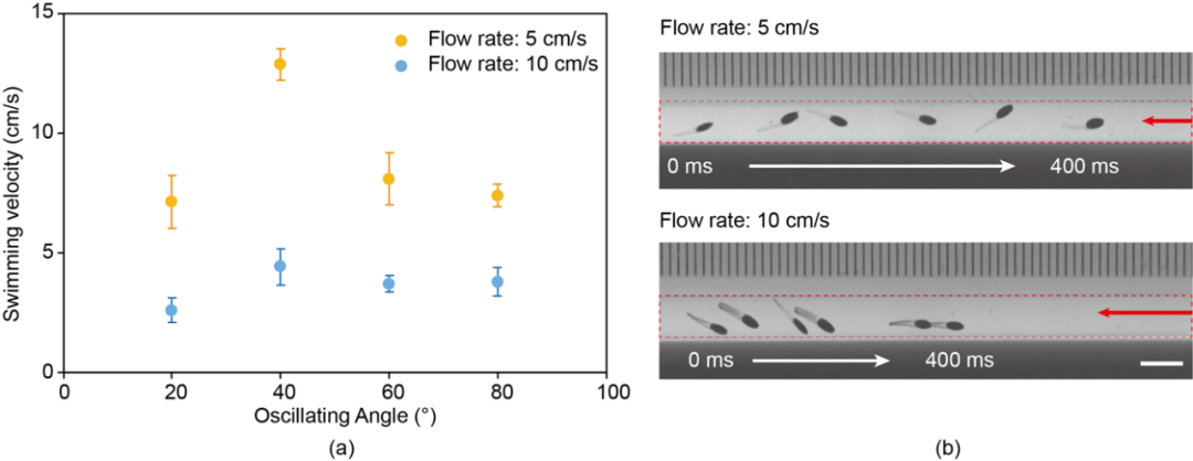 如图中所示,当磁场的振荡角为40°时,磁驱软体鱼的最大速度达到13cm/s(水流速度5cm/s),而水流速度加到10cm/s时,可以达到4cm/s的游泳速度。